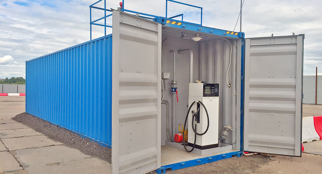 В контейнерных АЗС (Мобильная заправочная станция) используются двухстенные резервуары, межстенное пространство которых заполняется тосолом или азотом с установкой датчика контроля за утечками. Резервуары комплектуются электронными или механическими уровнемерами, линиями выдачи и линиями налива, а также необходимыми системами в соответствии с СП 156.13130.2014 (линия деаэрации, линия выдачи, замерной люк). В технологическом отсеке контейнерной АЗС располагаются насосы перекачки с бензовоза, топливно-раздаточные колонки и автоматика, учитывающая расход топлива, щит управления АЗС. Мобильную АЗС (контейнерные заправки), в зависимости о целей использования можно укомплектовать топливораздаточными колонками разного вида: -в зависимости от количества видов топлива колонка может иметь от одного до четырех рукавов с возможностью отпуска топлива на две стороны;-в зависимости от необходимой производительности есть возможность установить колонки со скоростью выдачи топлива от 50 до 350 литров в минуту;-в зависимости от системы выдачи топлива колонки могут быть однострочными и двухстрочными с возможность подключения пульта управления или компьютера оператора. Это же устройство, но без топливораздаточной колонки, называется контейнер хранения топлива (КХТ) или иногда их еще называют контейнер топливный.
